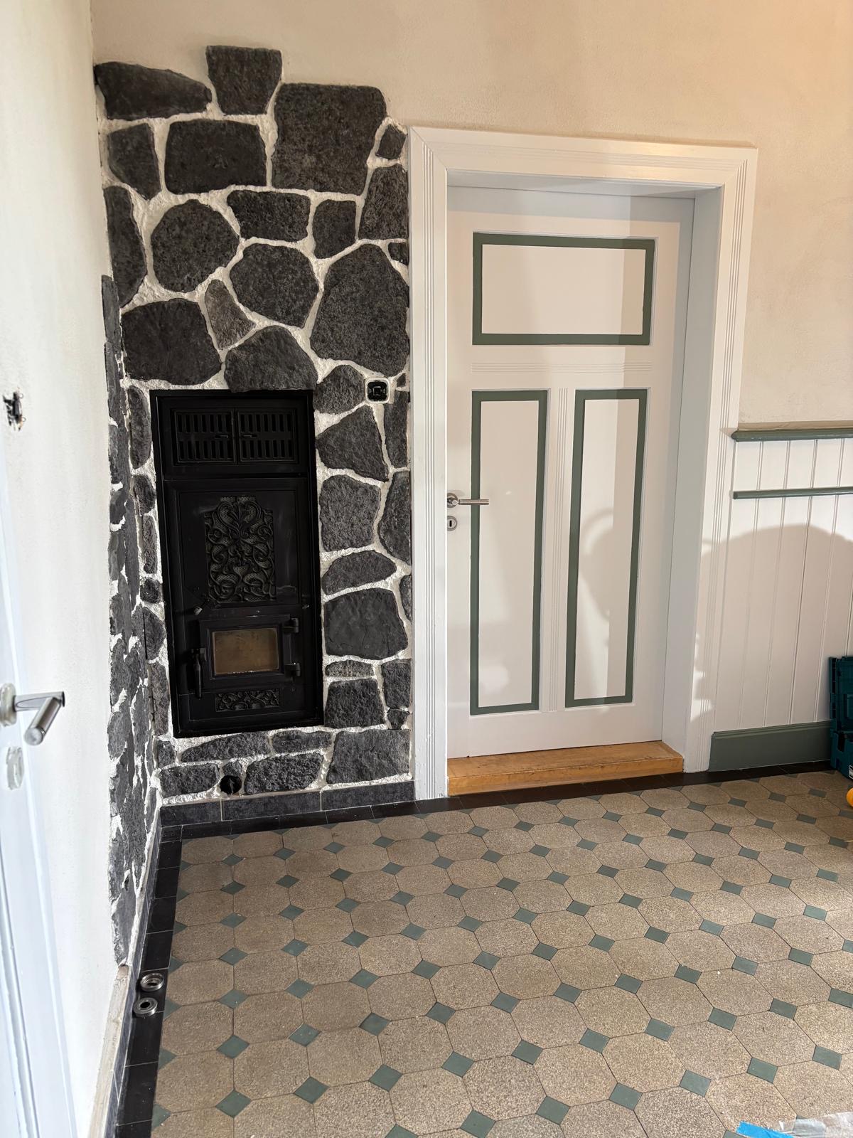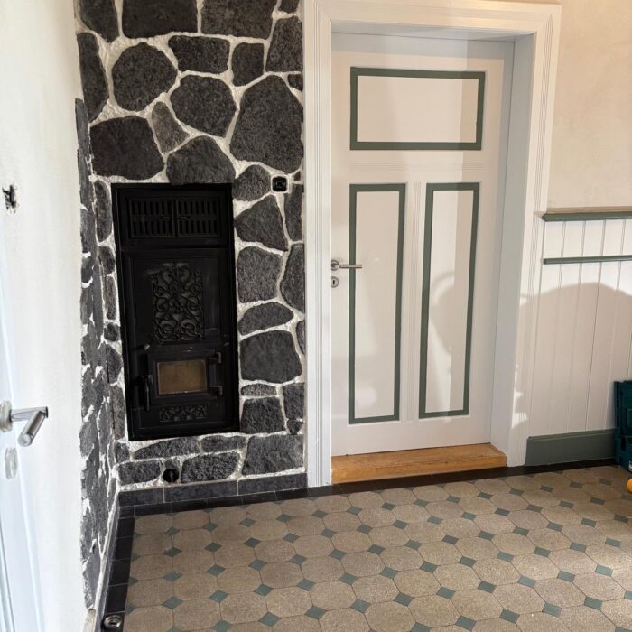Der alte Charme des Eingangsbereiches wurde mit traditionellen Produkten wiederhergestellt. Die neuen Farben wurden an den alten Boden angepasst